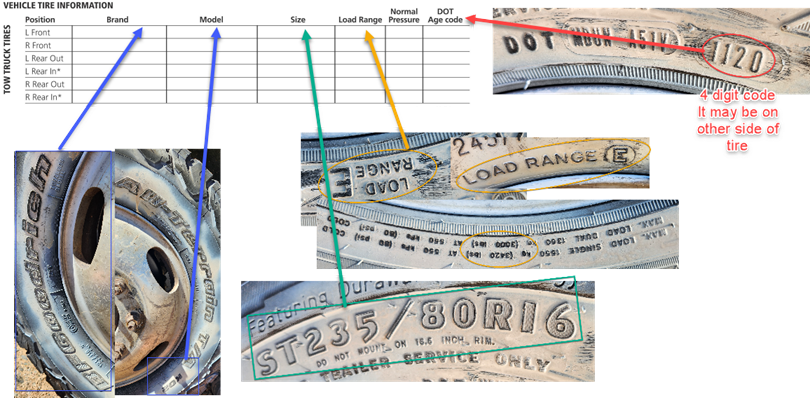 All information is found on the tires. The information may not be in the exact location found in the image. The Age Code should be read and entered from each tire. The Age Code is usually listed on one side of the tire, which may require you to find it on the other side. Please verify the information on each tire, as sometimes the tires are different. The tire pressure should be listed based on how you usually keep the tires. If you don’t know, check each tire’s tire pressure and write that on the form for each tire.